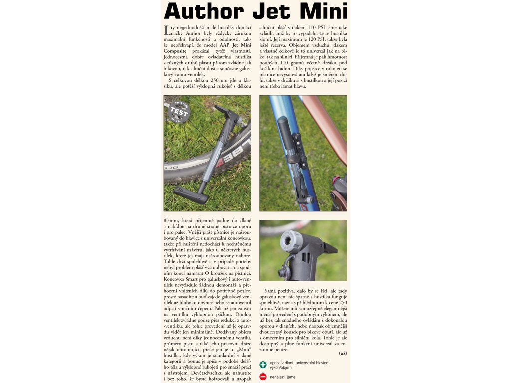 Hustilka AUTHOR Jet Mini Composite poskytuje rychlé a jednoduché nahuštění pneumatik. Nejvyšší dosažitelný tlak je 120 PSI (0,83 MPa). Nová SMART hlava pro snadné použití na galuskový ventil (FV) nebo autoventil (AV). Součástí této lehké kompaktní hustilky je držák, který snadno připevníte do závitových vložek na rámu jízdního kola.