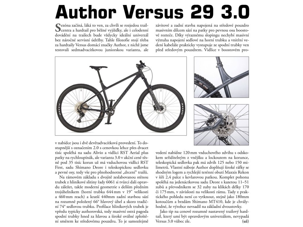 Trailové 29“ kolo s kvalitním osazením a moderní geometrií. Odolný a přitom lehký duralový rám s pevnými osami a velkým slopingem zajistí Authoru Versus 29 3.0 perfektní obratnost i na náročných technických tratích. Velká kola umožňují skvělou průchodnost terénem, snadné překonávání nerovností a také relativně nízký valivý odpor při asfaltových přesunech. Vzduchová vidlice RST s lockoutem, pevnou boostovou osou a zdvihem 120 mm si poradí i s velmi těžkými traily. Zdolání prudkých sjezdů usnadní teleskopická sedlovka Kind Shock. 11rychlostní řazení s jednopřevodníkem má na starosti sada Shimano Deore, od stejného výrobce jsou spolehlivé hydraulické kotoučové brzdy s velkými disky. Objemné pláště Maxxis Rekon nabízí jistotu v jakémkoliv terénu, nezaleknou se ani hlubokého bláta a skvěle drží i na mokrých kořenech. Tento stroj se cítí nejlépe na jezdivých rychlých singltrecích, kde nabídne perfektní ovladatelnost a moře zábavy. Neztratí se ale ani v bikeparku plném skoků a lavic, zvládne i wallride a menší dropy. Tedy skoro všechno jako mnohem dražší celoodpružené modely. Na rozdíl od nich ale umožňuje i svižné přesuny po lesních či polních cestách. Dobře tak může fungovat i jako univerzální kolo pro vyznavače trailového ježdění, kteří se nechtějí spoléhat jen na lanovky a vleky. S tímto kolem si užijete i výjezd na kopec a ještě více následný sjezd. To vše za zlomek ceny sjezdových či enduro speciálů.