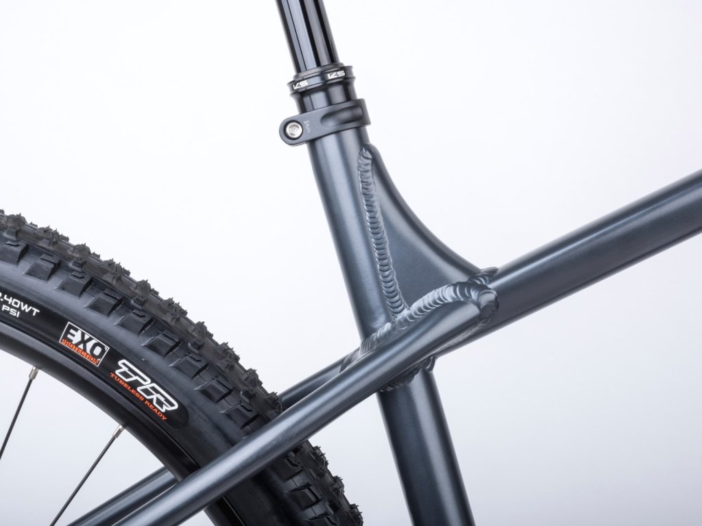 Hydroformní duralový rám s 2× zeslabovanými trubkamis a moderní downcountry geometrií
