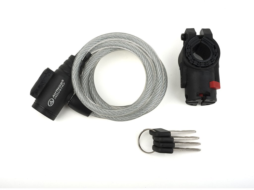 Spirálový zámek s univerzálním otočným držákem na sedlovku, lanko ocel l. 1500 mm, 4x klíč.